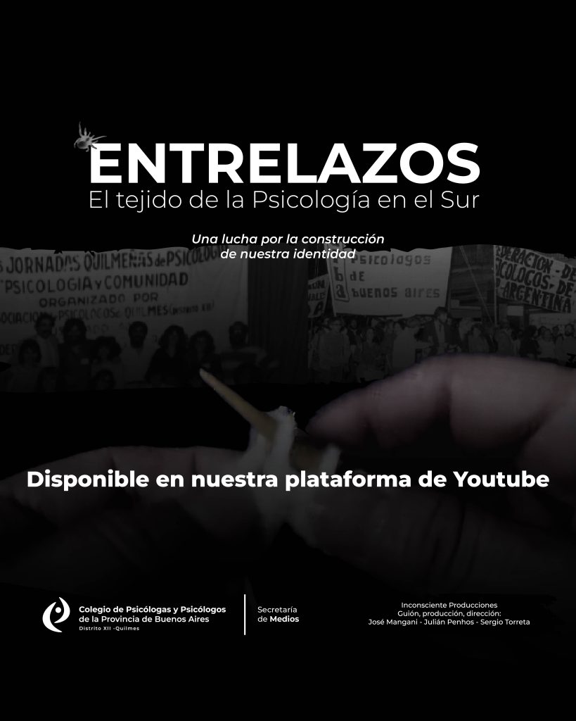 Ya está disponible en nuestro canal de YouTube el documental ENTRELAZOS: El tejido de la Psicología en el Sur. Una obra que recupera luchas, historias y voces que dieron forma a nuestra identidad profesional colectiva. Te invitamos a verlo, compartirlo y seguir tejiendo memoria. Link: https://www.youtube.com/watch?v=wfyPZU87aKs