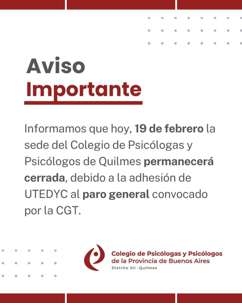 Aviso importante:Informamos que hoy,19 de febrero la sede del Colegio de Psicólogas y Psicólogos de Quilmes permanecerá cerrada, debido a la adhesión de UTEDYC al paro general convocado por la CGT