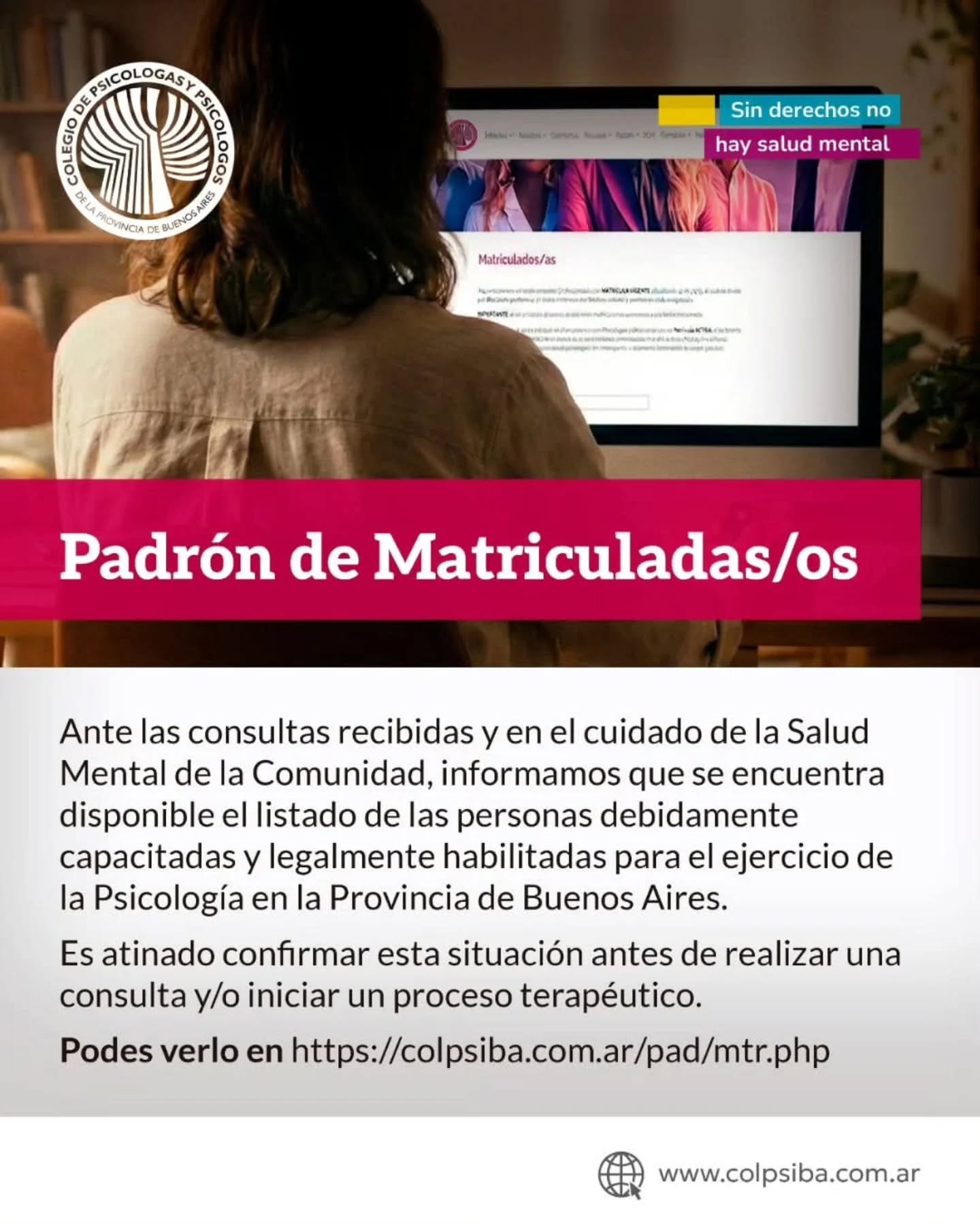 Ante las consultas recibidas y en el cuidado de la Salud Mental de la Comunidad, informamos que se encuentra disponible el listado de las personas debidamente capacitadas y legalmente habilitadas para el ejercicio de la Psicología en la Provincia de Buenos Aires