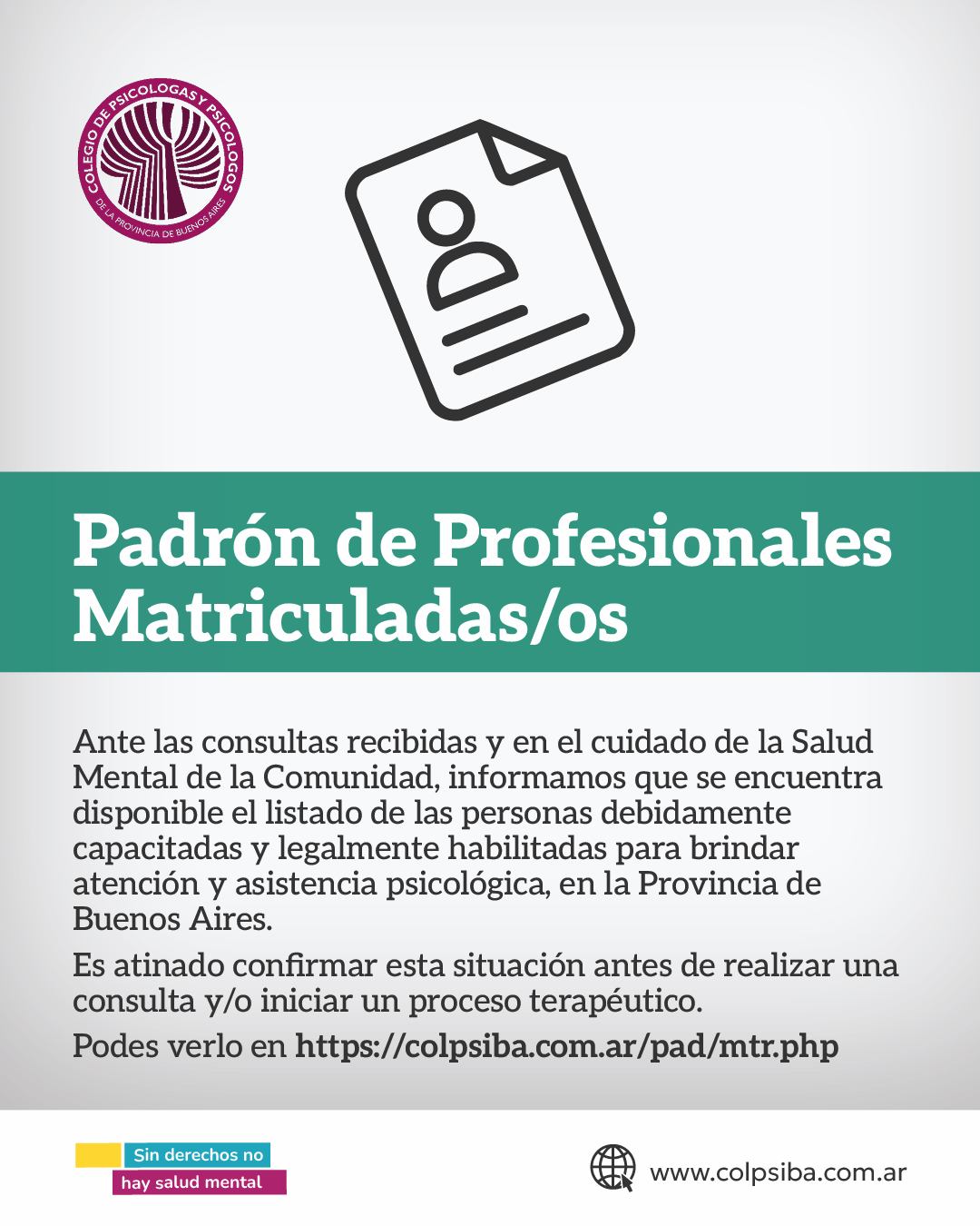 Ante las consultas recibidas y en el cuidado de la Salud Mental de la Comunidad, informamos que se encuentra disponible el listado de las personas debidamente capacitadas y legalmente habilitadas para brindar atención y asistencia psicológica, en la Provincia de Buenos Aires.
